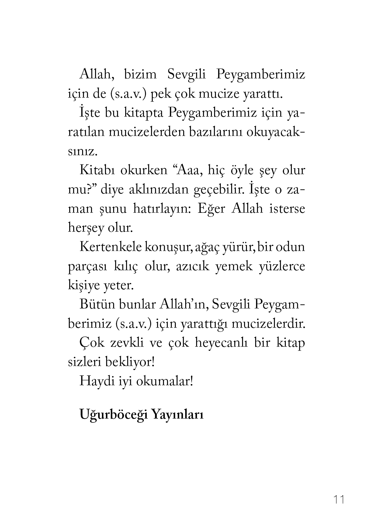 UĞURBÖCEĞİ YAYINLARI, çocukların manevi dünyalarını zenginleştirmeyi gaye edinen kitaplar yayınlamaya devam ediyor. İşte bu gaye doğrultusunda hazırlanan yepyeni bir kitap daha! ÇOCUKLAR İÇİN PEYGAMBERİMİZİN MUCİZELERİ! Daha önce Peygamberin Küçük Arkadaşları adlı çocuk kitabı ile, küçük okurların büyük ilgi ve beğenisini çekmeyi başaran Özkan Öze, son derece sade ama bir o kadar da renkli anlatımıyla Peygamberimizin mucizelerini çocuklar için yazdı.