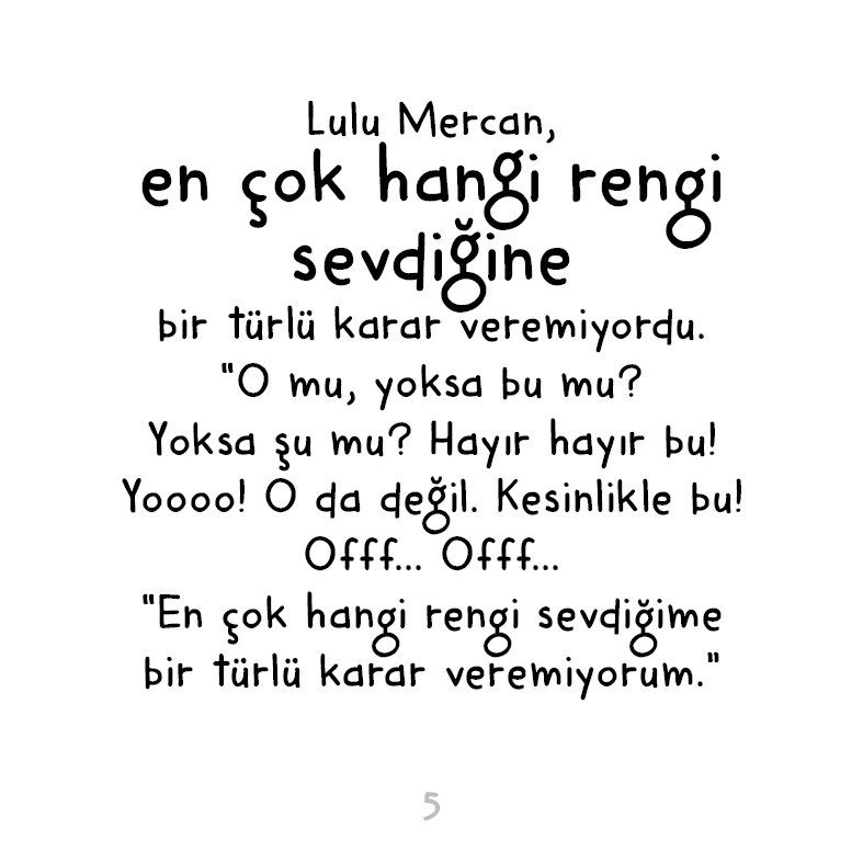 Lulu Mercan, en çok hangi rengi sevdiğine bir türlü karar veremiyordu. “O mu, yoksa bu mu? Yoksa şu mu? Hayır hayır bu! Yoooo! O da değil.