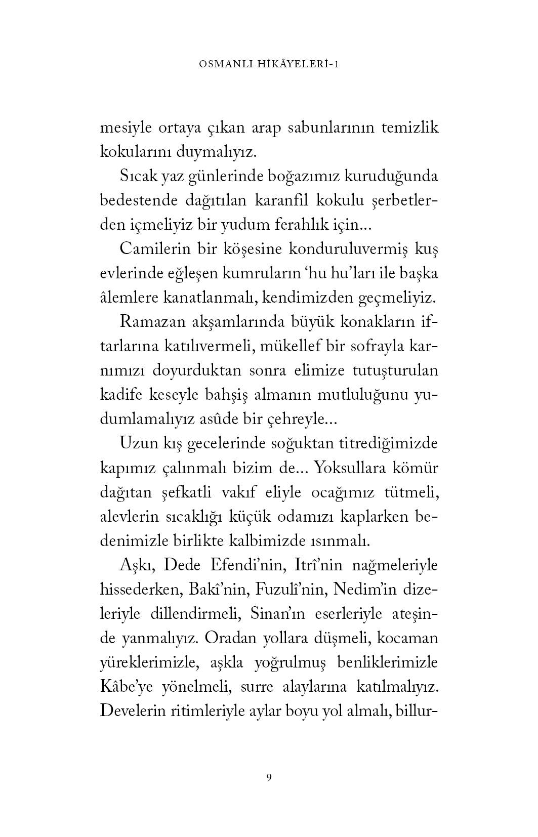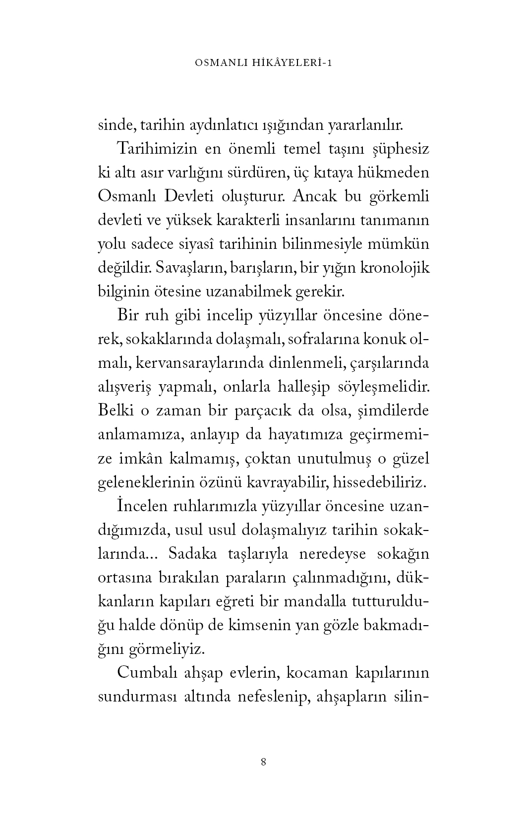 Altı asır varlığını sürdürüp üç kıtaya hükmeden Osmanlı’yı tanımak, o yüksek karakterli insanları anlamak için yüzyıllar öncesine uzanmalı, usul usul dolaşmalıyız tarihin sokaklarında… Sadaka taşlarıyla neredeyse sokağın ortasına bırakılan paraların çalınmadığını, dükkânların kapıları eğreti bir mandalla tutturulduğu halde dönüp de kimsenin yan gözle bakmadığını görmeliyiz.