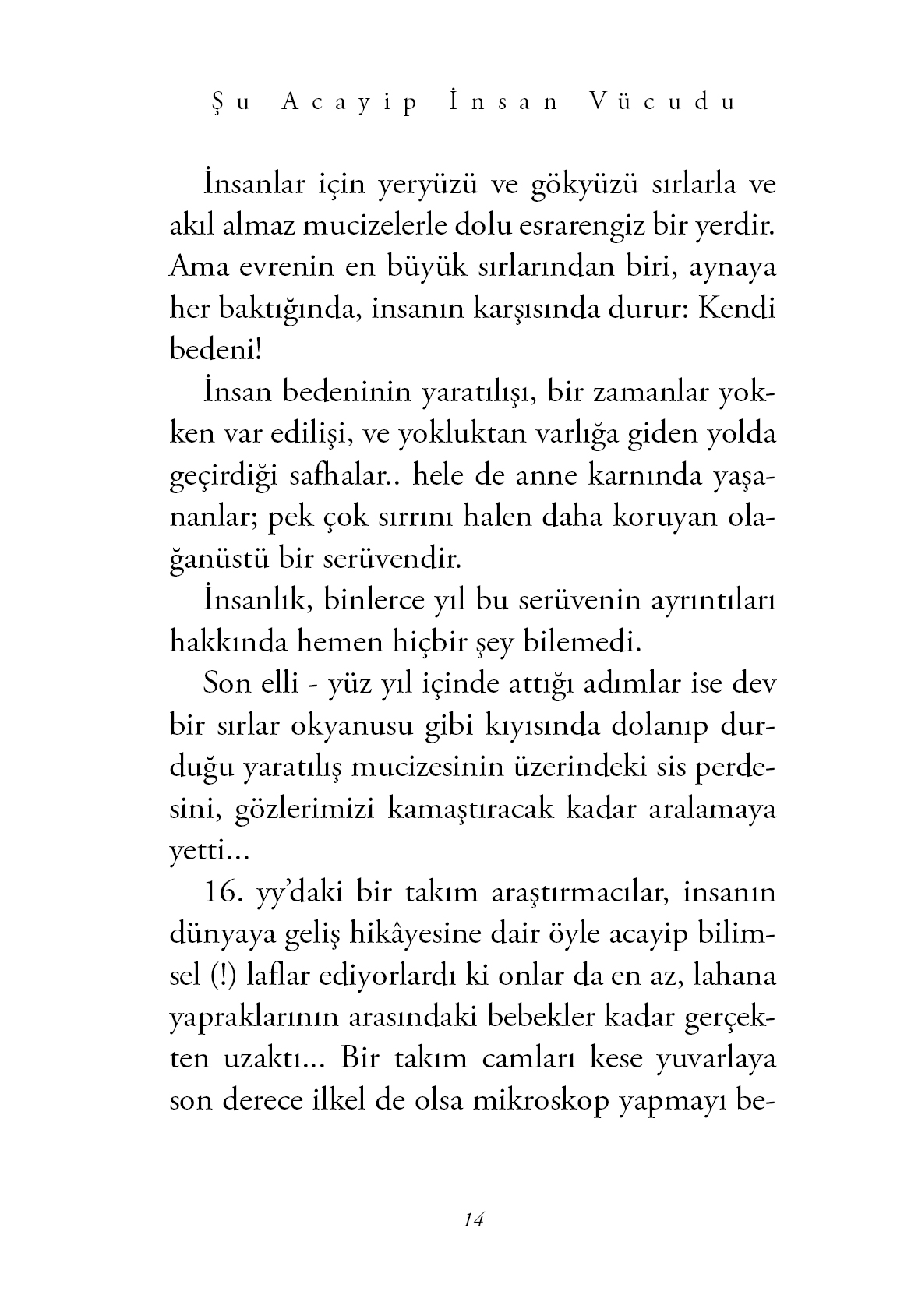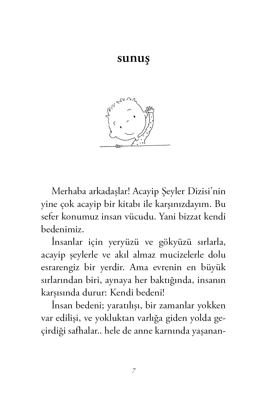 Merhaba arkadaşlar! Acayip Şeyler Dizisi’nin yine çok acayip bir kitabı ile karşınızdayım. Bu sefer konumuz insan vücudu. Yani bizzat kendi bedenimiz. İnsanlar için yeryüzü ve gökyüzü sırlarla, acayip şeylerle ve akıl almaz mucizelerle dolu esrarengiz bir yerdir. Ama evrenin en büyük sırlarından biri, aynaya her baktığında, insanın karşısında durur: Kendi bedeni!
